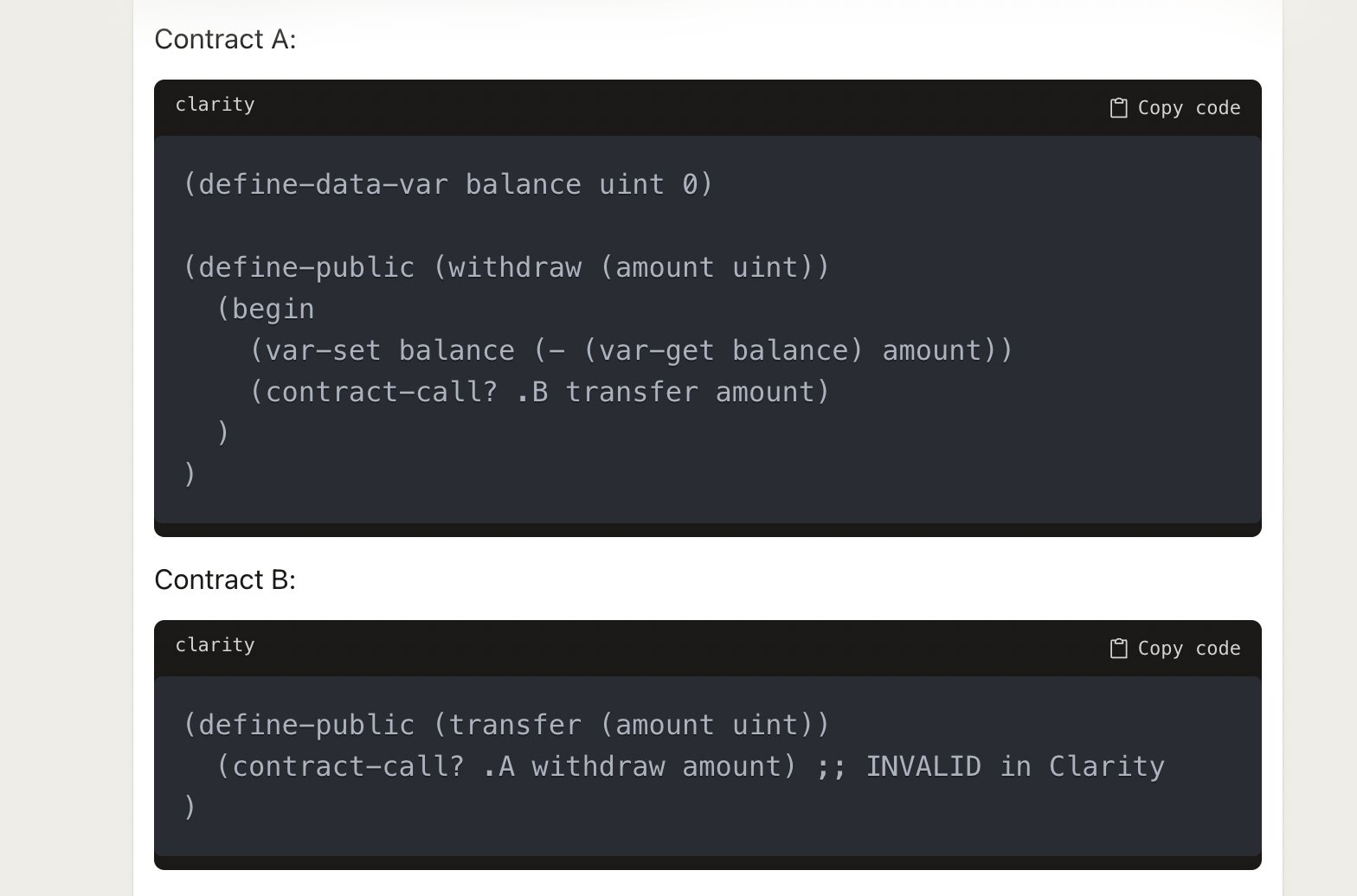So there is no way to write a Clarity contract that enables reentrancy like this. The language design fundamentally prevents it. This means developers don't have to worry about securing contracts against reentrancy in Clarity - it's handled at the language level.